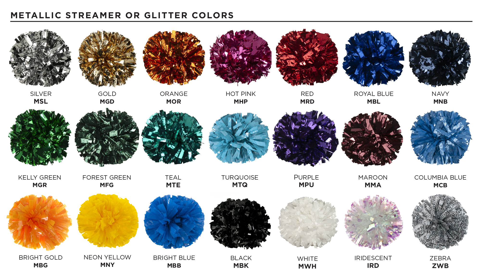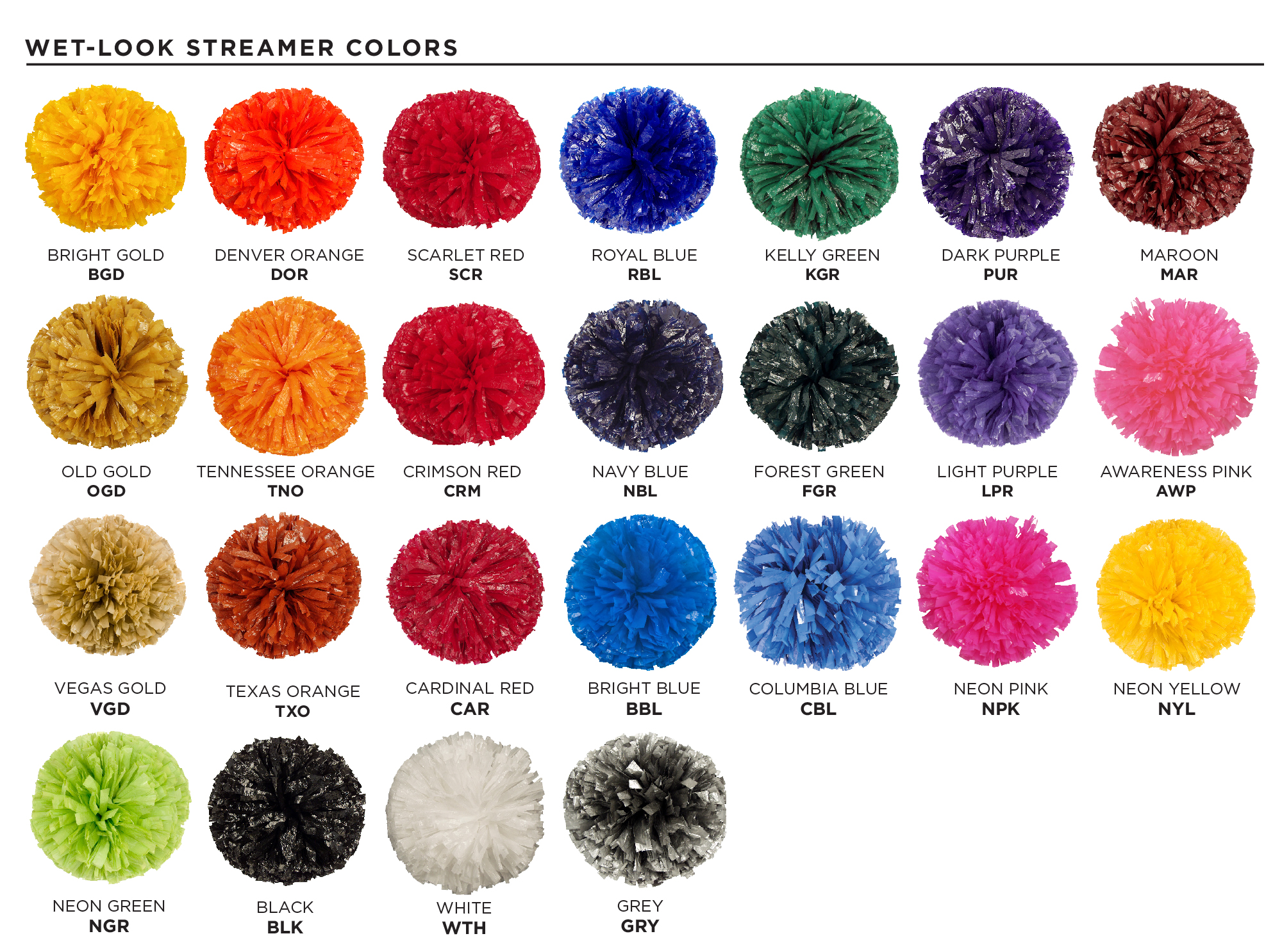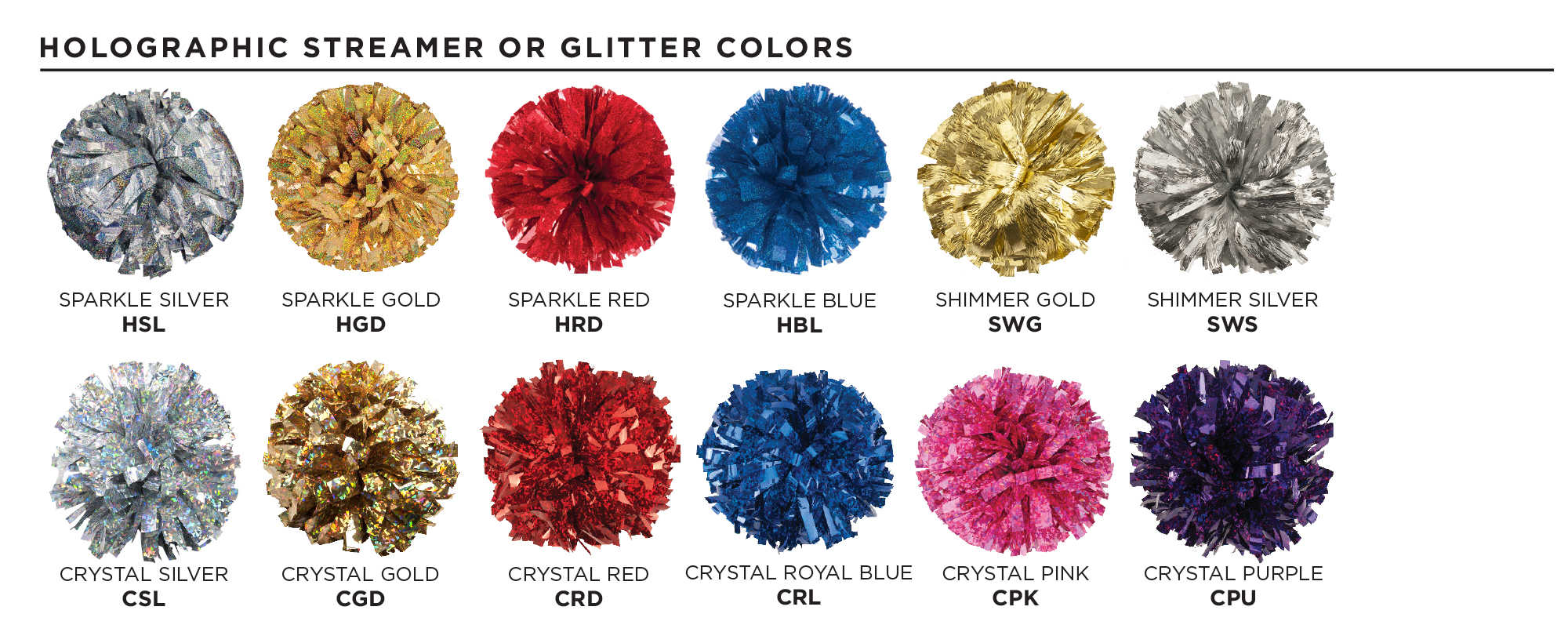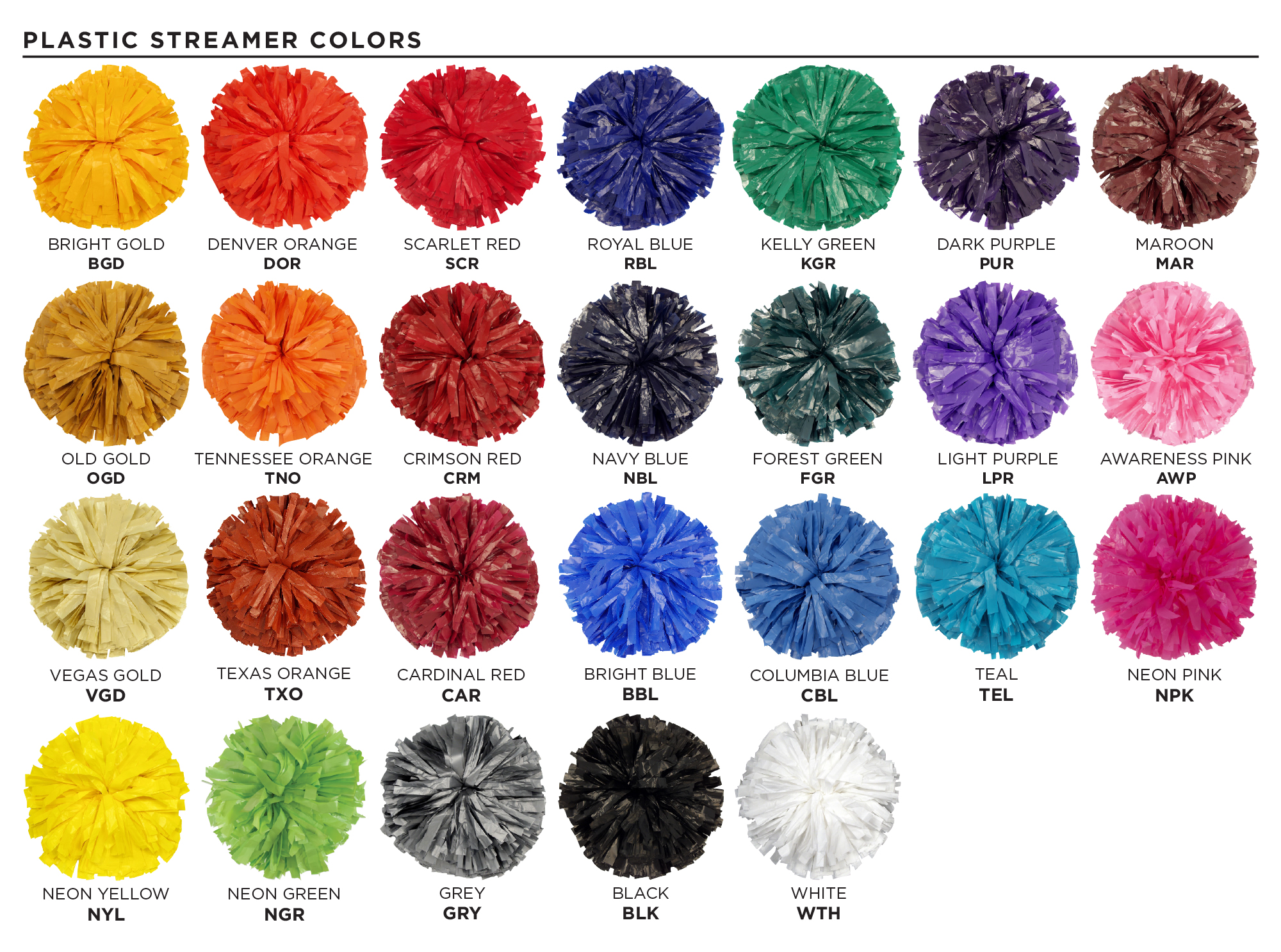 Show Poms are our most popular line of cheerleader poms. Standard Show Poms feature 1,024 - 3/4" wide streamers in any length you choose from 4 to 12 inches. There are 8 different pom handles from which to choose.